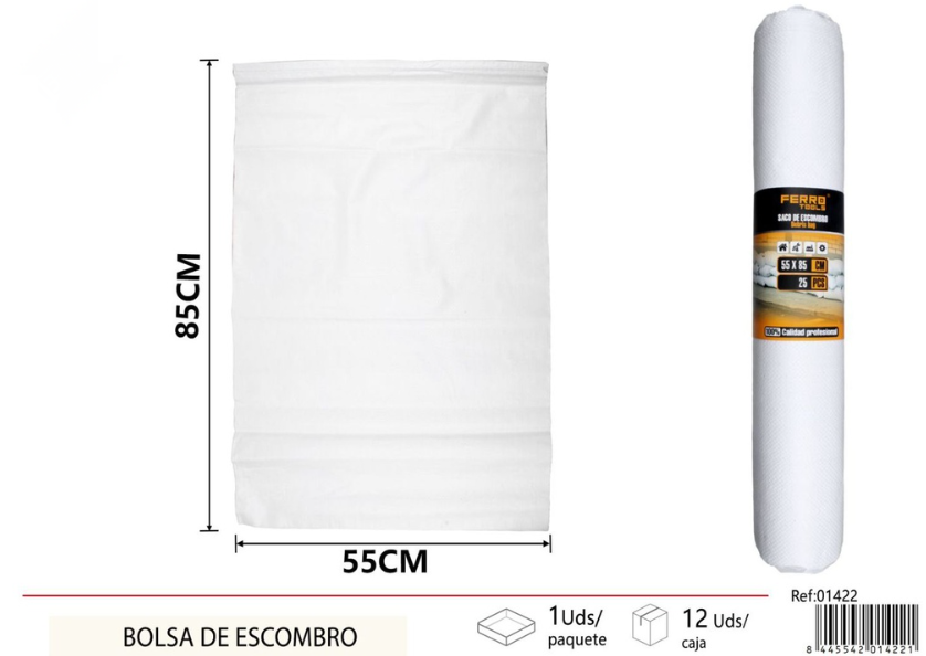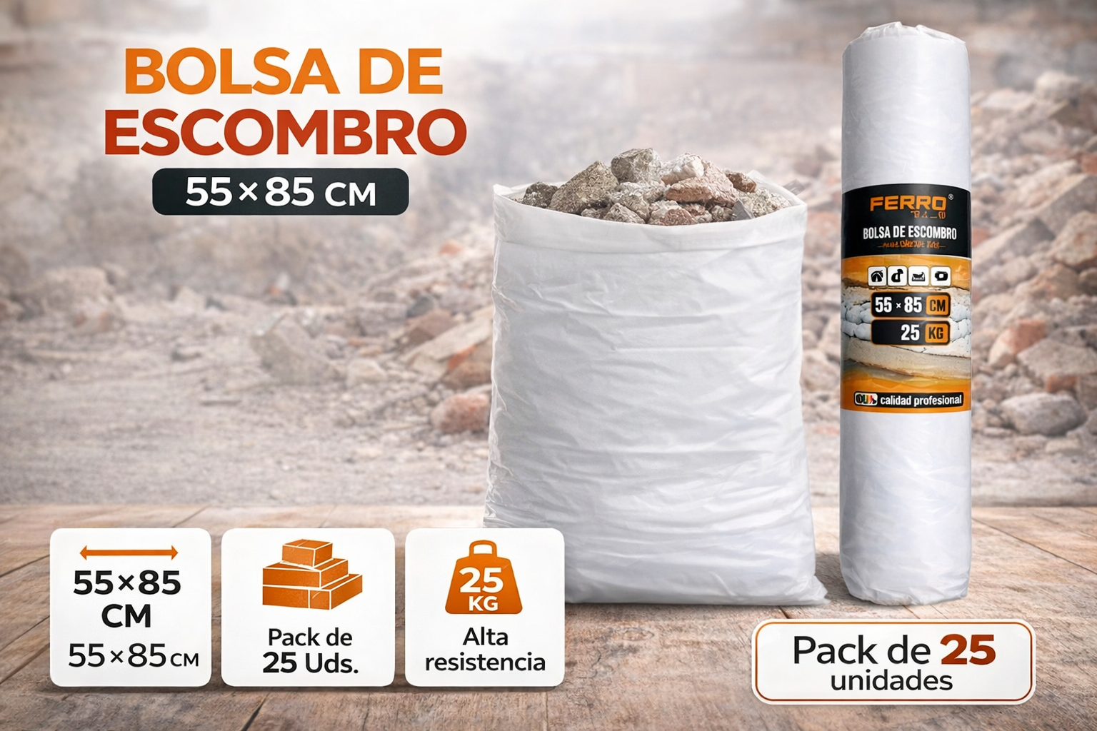 El pack de 25 bolsas de escombro blancas 55×85 cm es la solución perfecta para la gestión de residuos de obra, reformas y limpieza industrial. Fabricadas con polietileno de alta resistencia, soportan el peso de escombros, residuos de construcción, tierra o materiales ligeros sin romperse.