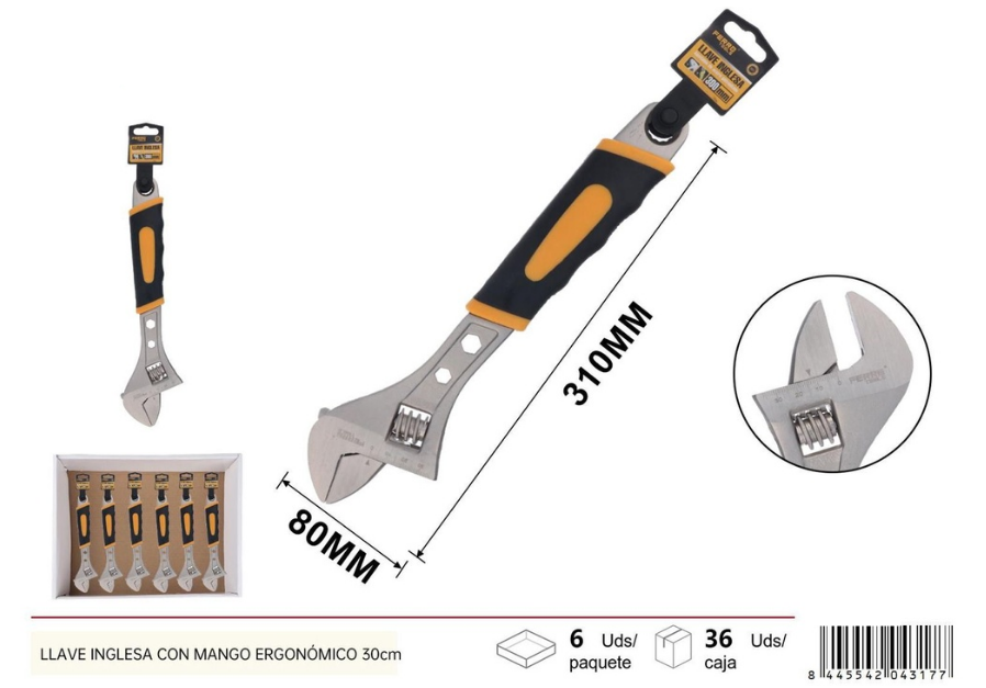 La llave inglesa ergonómica de 30 cm está diseñada para ofrecerte una experiencia cómoda y eficiente en cada uso. Su diseño adaptable asegura que puedas ajustar fácilmente diferentes tamaños de tuercas y pernos, mientras mantienes un agarre firme que reduce la fatiga incluso en trabajos prolongados. Ideal para profesionales y aficionados al bricolaje, esta herramienta prioriza la comodidad sin comprometer la funcionalidad.